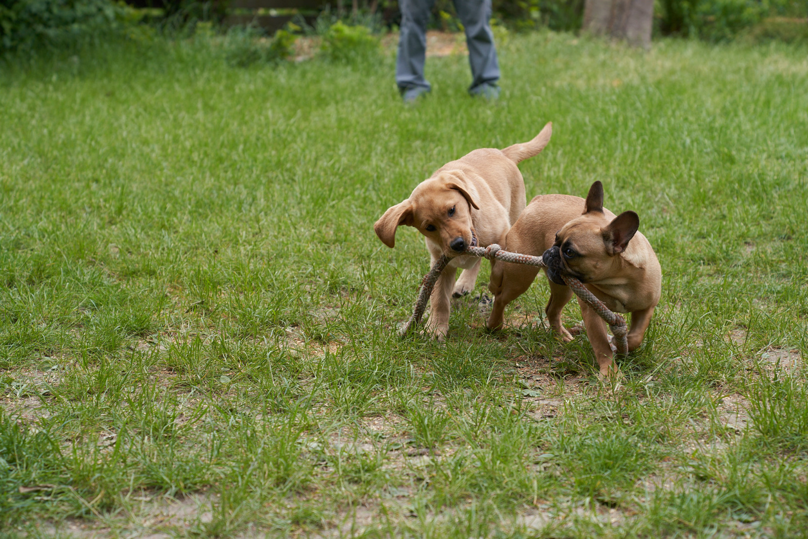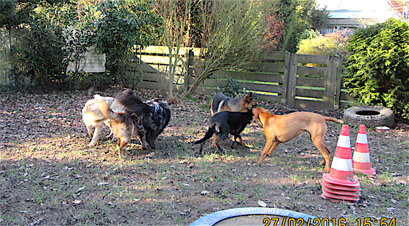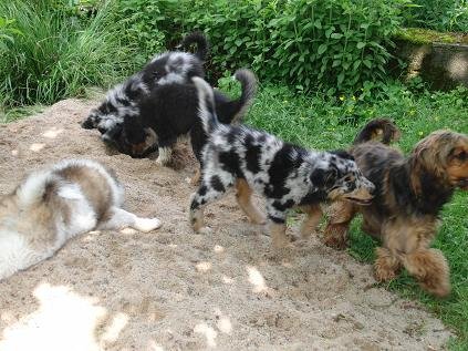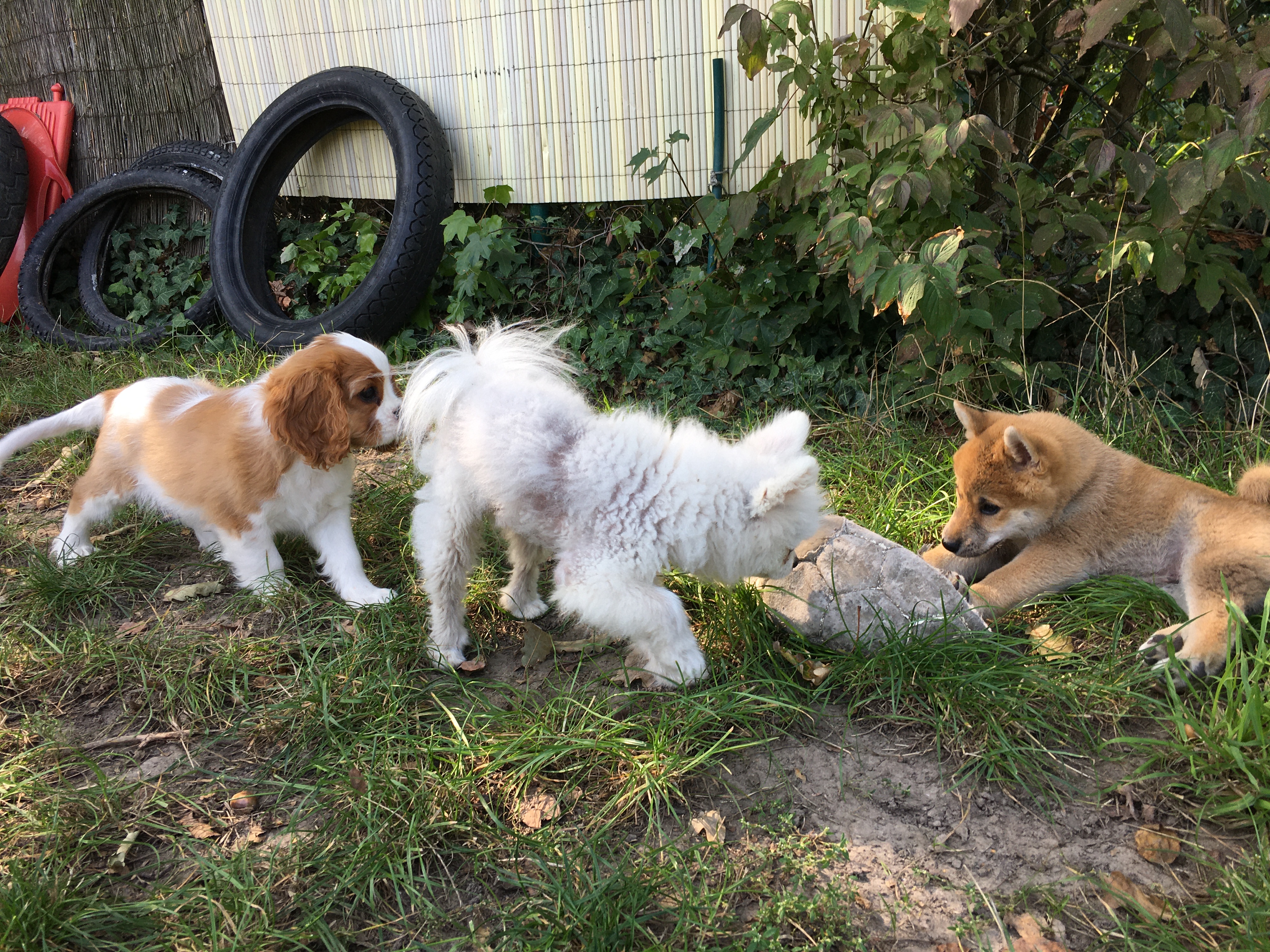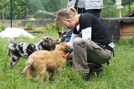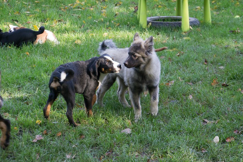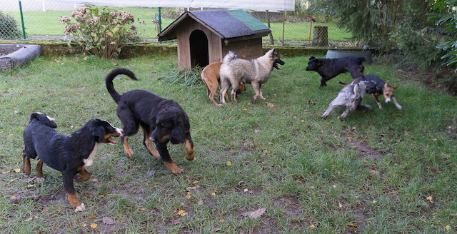 Die Hundekinder dürfen sich relativ frei entfalten, dazu gehört auch mal eine kleine Zankerei. Daraus lerne die Kleinen, beim nächsten mal umsichtiger zu agieren. Sie werden aber keinesfalls sich selber überlassen. Welpen können nicht alles alleine regeln. Mobbing wird nicht geduldet! Unsichere Hundekinder werden gestärkt, zu selbstbewusste Welpen lernen, vorsichtiger miteinander zu sein.